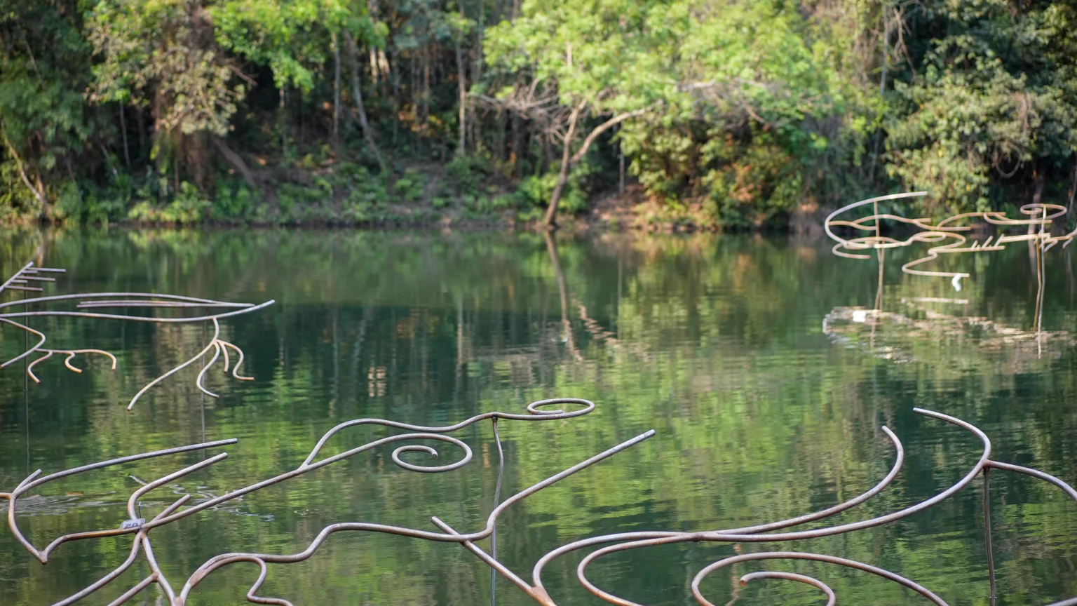 “Apenas depois da chuva” (Rebeca Carapiá): composta por 20 esculturas de ferro e cobre de até 5 metros de altura, esta instalação comissionada é exibida sobre um dos lagos do Inhotim. Nascida de uma imersão da artista na Serra da Capivara (PI), a obra investiga a relação entre água e território, trazendo para o lago desenhos gravados em metal que surgem como marcas efêmeras após a chuva. A natureza circulante (vento, luz, reflexos no espelho d’água) adiciona camadas sensoriais à experiência.